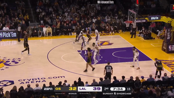 In this clip, you see good rim pressure from Schroeder (one of his biggest offensive strengths) and a nice extra pass from Rui Hachimura. These are the looks the Warriors will live with from LeBron, but the looks LeBron wants to take to conserve his legs. He has to knock these down at a 35%+ rate to keep the Golden State defense honest.